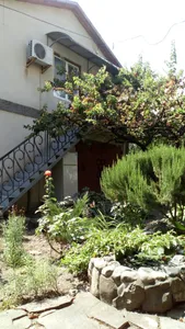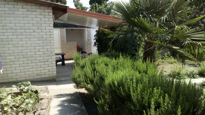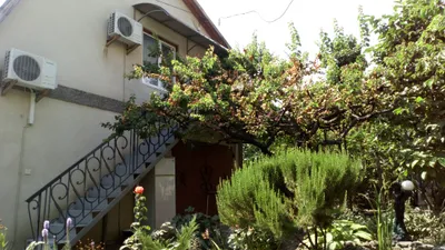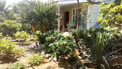 Красивый большой зеленый двор с субтропическими растениями и много цветов, есть пруд с красными рыбками.